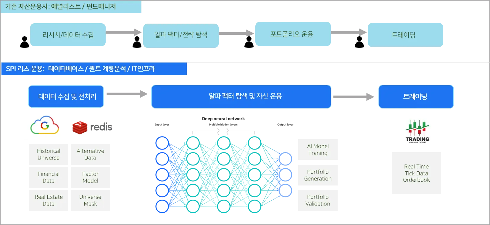 기존 자산운용[데이터 수집 - 알파 팩터/전략 설정/포트폴리오 운용- 트레이딩] 과정을 데이터베이스 및 IT인프라를 기초로 고도화 및 효율화